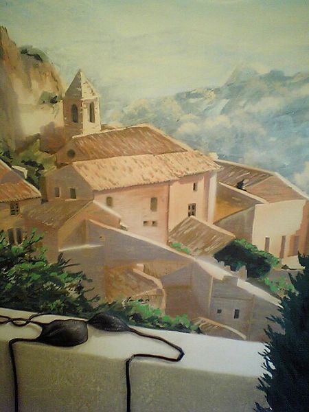 A beautiful scene painted in a bathroom alcove. Ignore the potted tree for now, I changed it to something more pleasing.