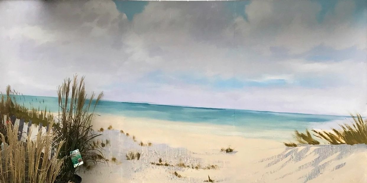 The mural was created to enhance the beach area at the bottom of the garden. The sides of the mural were framed with foliage to 'lose' the edges.