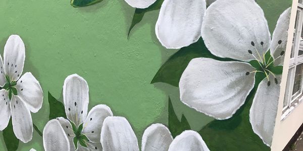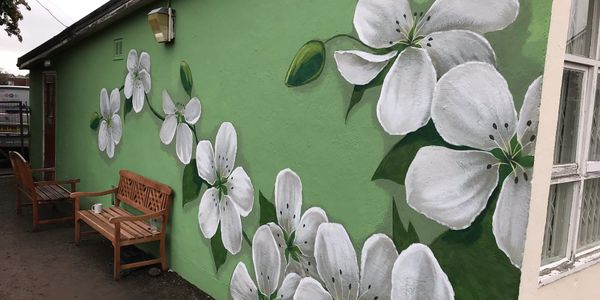 A blossom mural painted for a Cancer aftercare centre. A garden area was created by Love Your Garden for the centre and the mural added interest and helped to soften the lines and create a soothing backdrop.
