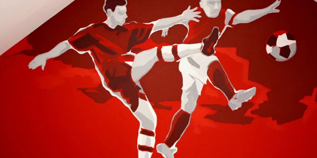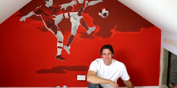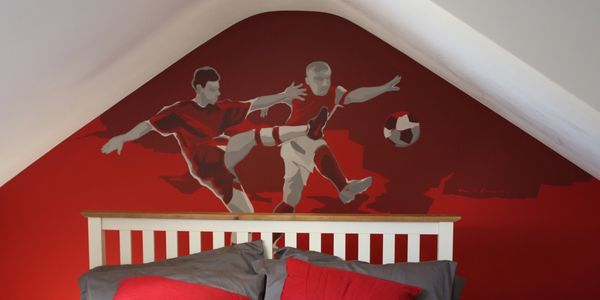 A football mural painted in a boy’s bedroom loosely based on Bournemouth FC colours but with a generic feel to comply with licensing issues.
