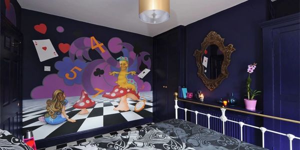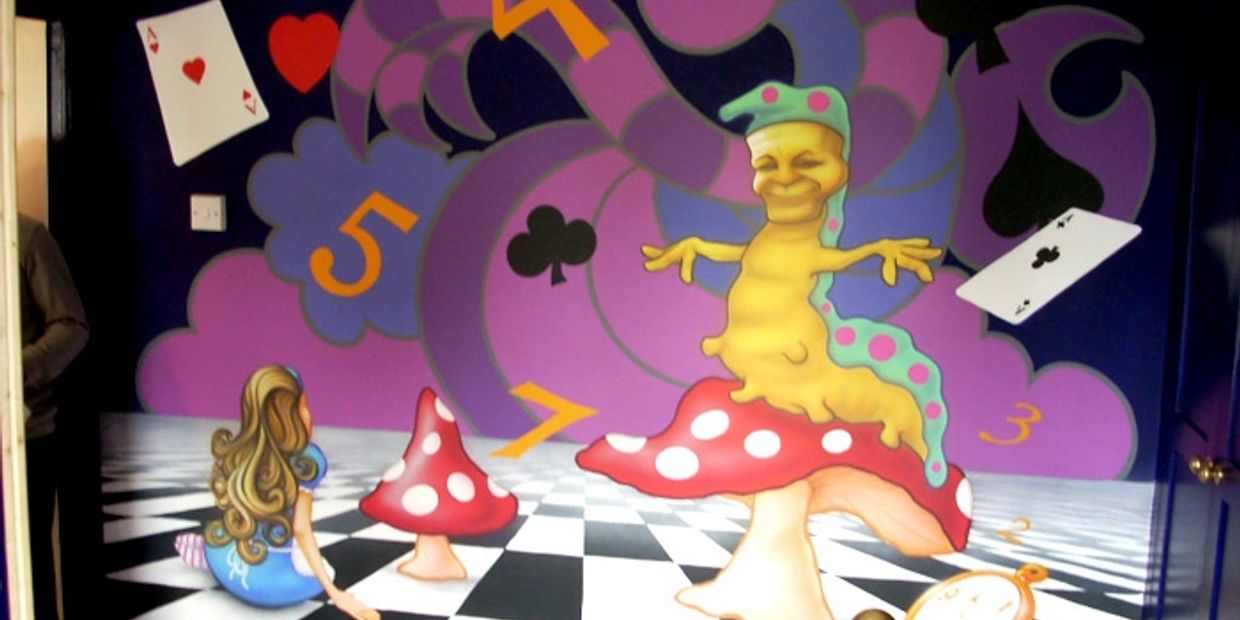 A flamboyant mural on a dining room chimney breast featuring original art based on The Mad Hatters Tea Party and featuring caricatures of the family's own pet house rabbits. I have some better photos somewhere including some of additional work carried out on the day with which I will replace these screen grabs when I find them!